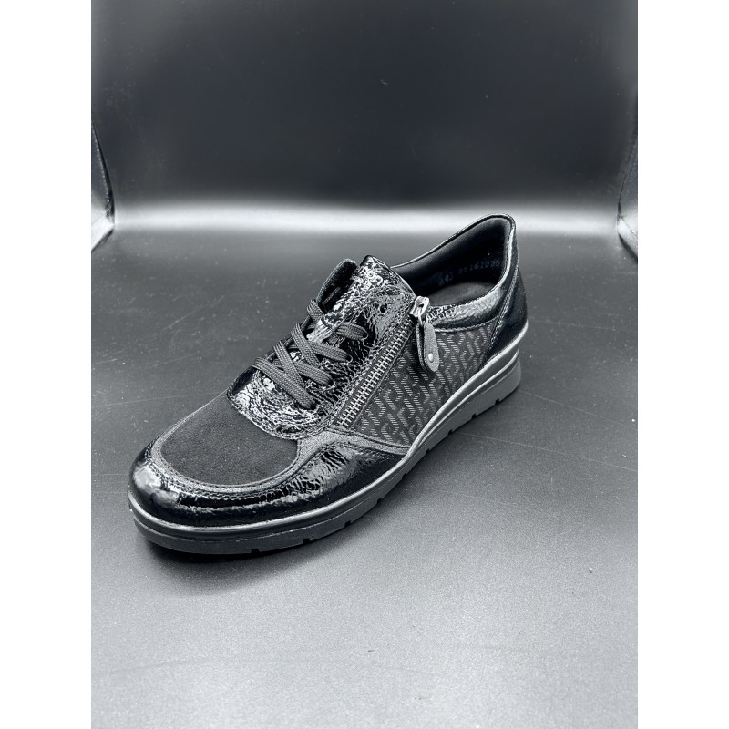Pieds heureux, vie heureuse ! Avec ces baskets basses Remonte noires pour femme, on peut se faire voir partout ! Les lacets sont complétés par une fermeture éclair, ce qui garantit un bon maintien et un ajustement parfait. La semelle intérieure rembourrée et amovible et la semelle avec talon compensé flexible et amortissante sont des atouts supplémentaires. La largeur G confortable offre suffisamment d'espace pour que vos pieds soient à l'aise même lorsqu'elles sont portées longtemps. La doublure de qualité supérieure en véritable fourrure d'agneau et velours convainc par une sensation très douillette et particulièrement chaude au niveau des pieds. Le confort rencontre le style !