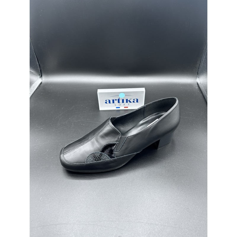 Chaussure femme, forme mocassin habillé, de la marque française Artika. Empeigne en cuir lisse, extra souple, coloris noir, soulignée d'un duo d'empiècements python et verni noir, à l'avant du pied. Duo d'élastiques d'aisance au cou-de-pied. Doublure cuir avec soutien de la voute plantaire. Talon trotteur de 4.5 cm, absorbant les chocs.